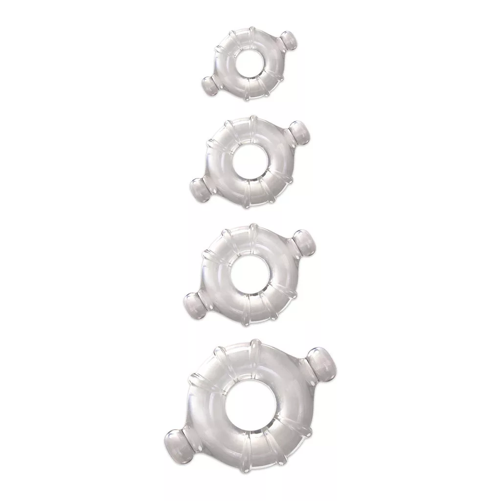 A készlet négy különböző méretű gyűrűt tartalmaz, így mindig megtalálhatod azt, amelyik a legkényelmesebb számodra. Nem kell többé kompromisszumot kötnöd: ha az egyik túl szoros vagy épp túl laza, a másik biztosan ideális lesz. A színtelen, rugalmas gumi anyag teljesen bőrbarát, és könnyen tisztítható, így a játék mindig higiénikus marad.
