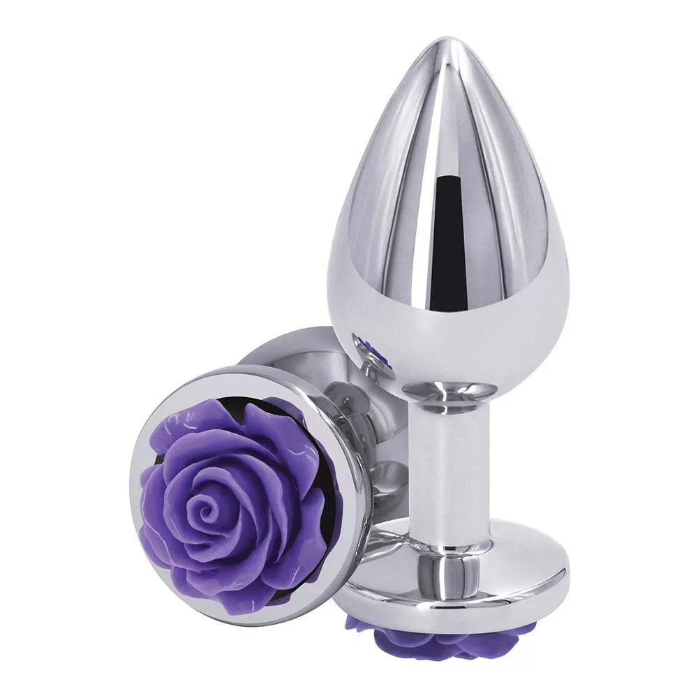 Rear Assets fém anál plug, ezüst, lila rózsás talp (közepes)