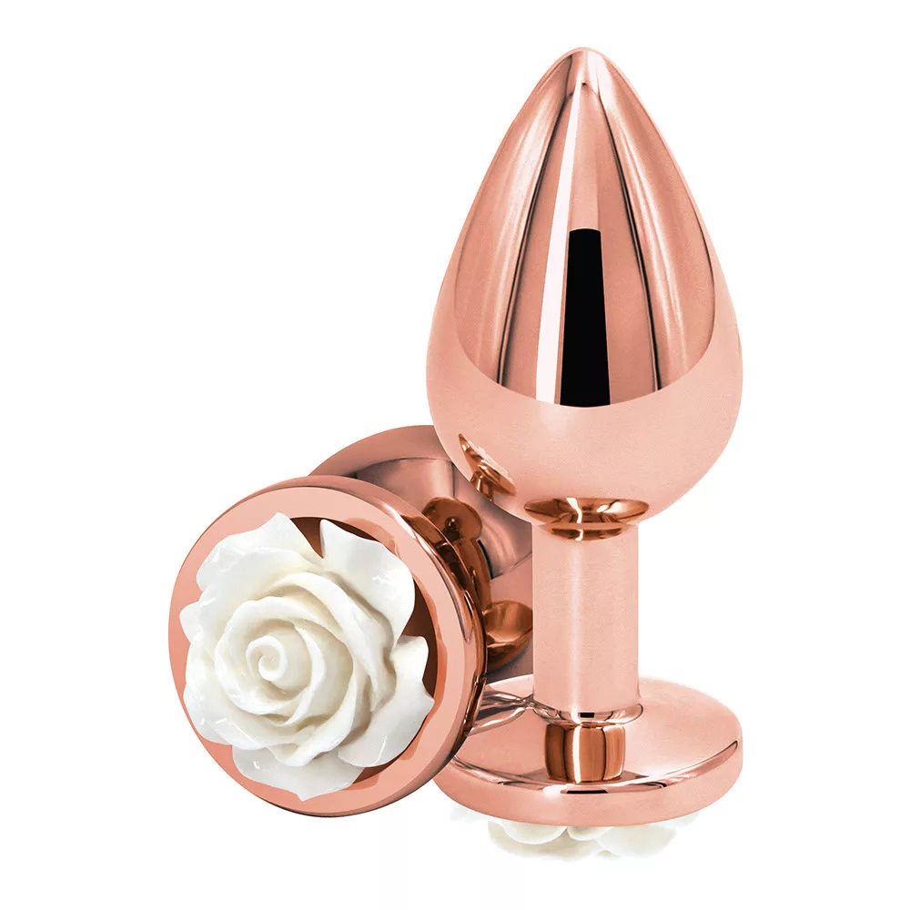 Rear Assets fém anál plug, rosegold, fehér rózsás talp (közepes)